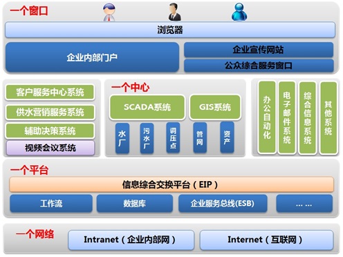 該系統是一種以基于物聯網的一體化綜合管理信息平臺為核心,結合數學仿真模型建立計算機智慧輔助決策的智慧管理系統,系統涵蓋云計算數據中心、水質檢測、指揮排澇、污水處理、自來水生產調度管理、水務智慧安防和水務運營等功能。系統包含:GIS系統、GPS巡檢系統、SCADA系統、視頻監控系統、客戶服務管理系統、網上營業廳系統等系統。其中,基于物聯網技術的云計算水務數據中心分別于其他子系統緊密連接,從而消除了以往水務各個管理系統信息資源不能共享的弊端,降低了運行成本,實現了辦公自動化、數據一體化、流程整合化、策劃科學化,以精細、動態、智能的方式進行水務管理、服務、決策工作,使水務管理達到智慧狀態。