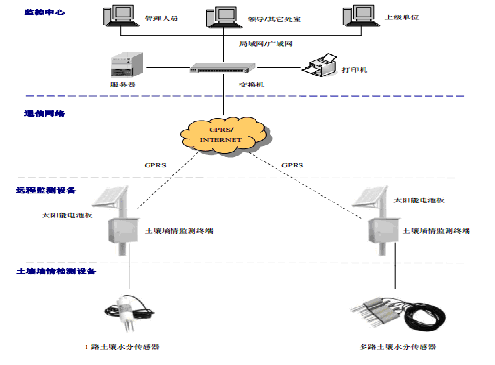 該系統主要由監控中心、通信網絡、遠程監測設備和土壤墑情檢測設備四部分構成。